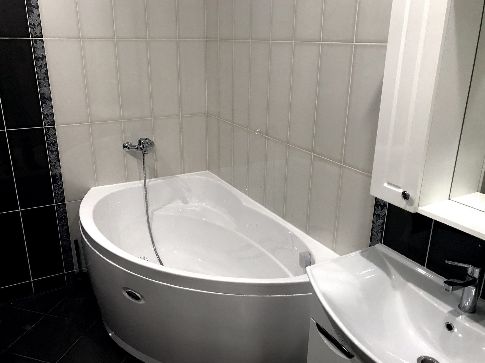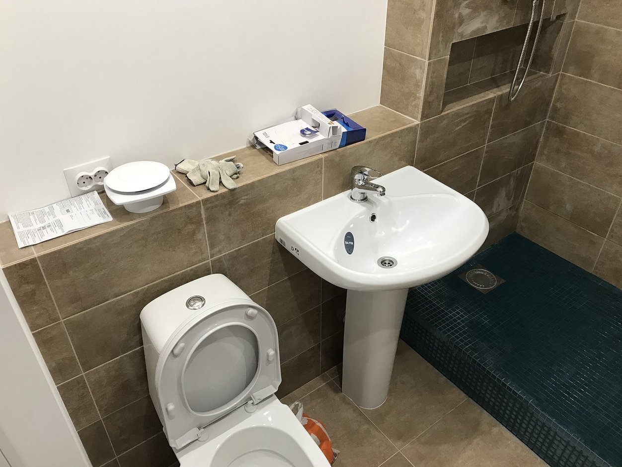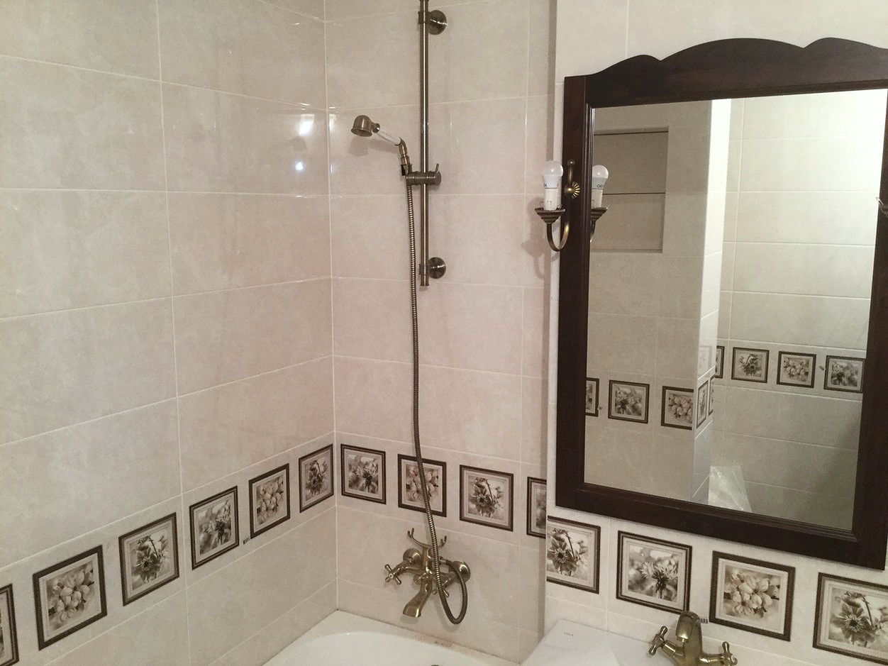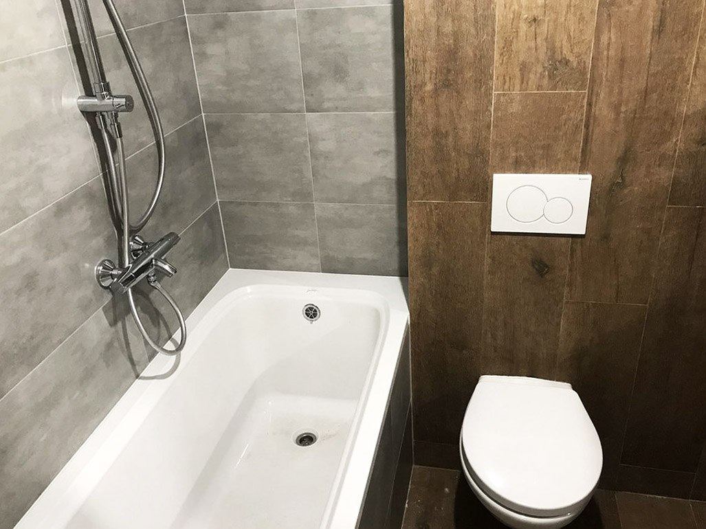 Провели ремонт ванной комнаты: • разводка труб водоснабжения и канализации; • монтаж коллекторного узла; • монтаж перегородки; • установка сантехники; • укладка плитки на стенах и полах.